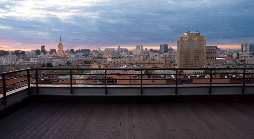 Пространство находится на 15 этаже с удобным проходом на просторную и безопасную террасу площадью 80 м² с видом на закатную сторону. С площадки открывается впечатляющий обзор на Алматы-Сити, сталинские высотки и городской пейзаж