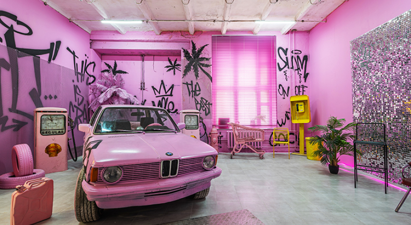 Розовые барные и обычные стулья, Pin-Up кактус и даже розовый скелет - всё здесь для тех, кто хочет выделяться и удивлять. Мягкие меховые пледы и розовый телевизор - детали, которые делают атмосферу комфортной и по-настоящему уникальной;
