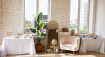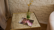 - зона с розовым диваном, напольный Pin-Up столики, мелкий декор