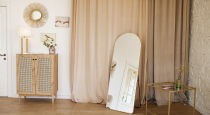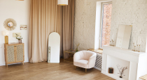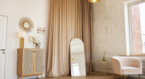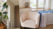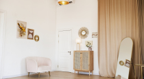 - зона с розовым креслом и бархатными шторами, белый Pin-Up с лампой и картинами, туалетный столик и пуф, настольная лампа