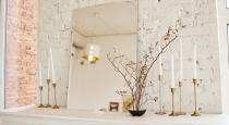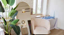 - зона с серым бархатным диваном, зеркальными столиками, Pin-Up торшером, пальмами и другим мелким декором
