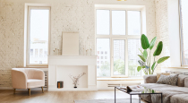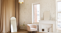- зона с украшенным белым камином, желтое кресло, Pin-Up ковер