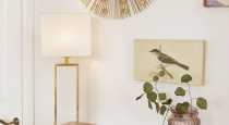 - серый диван с подушками, картинами и торшером, настенное классическое Pin-Up