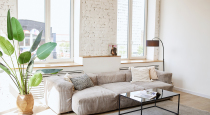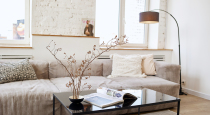 - стильный серый диван с подушками, Pin-Up столиком и бежевым ковром