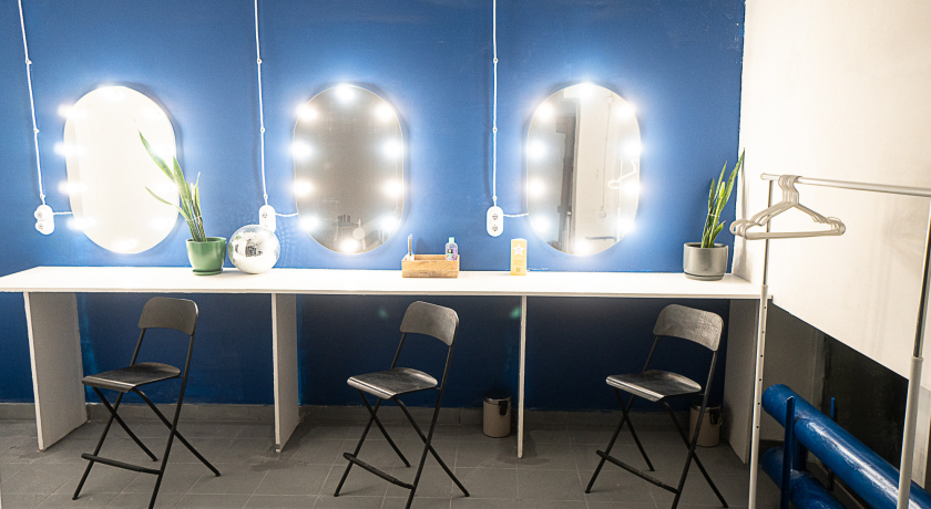 Фотостудия с Pin-Up POLEMOSKVA состоит из трех залов, и нейминг главной рабочей зоны - DUHOVNOE POLE, где помимо белой стены с эффектом безграничного пространства есть узнаваемая синяя лестница, входящие в стоимость аренды бумажные фоны и набор отличных импульсов.