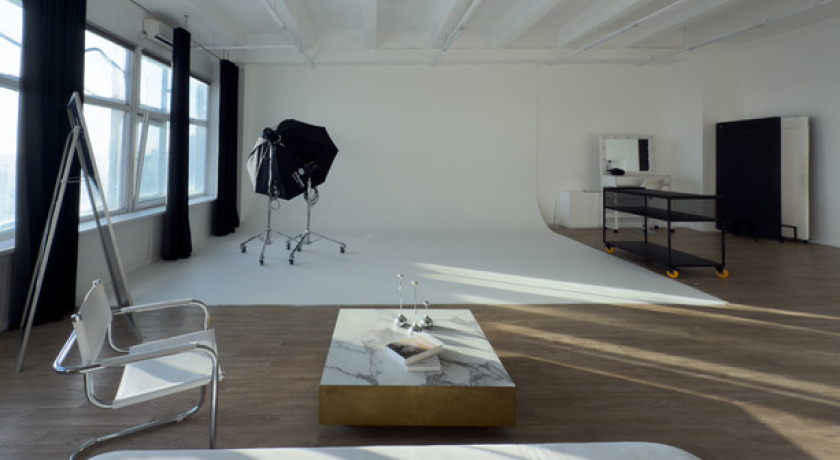 - Белая циклорама 6,5 × 4,5 м и минималистичный интерьер - универсальный фон для любых идей.
