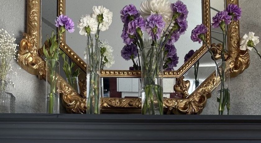В зале Pin-Up стоят живые цветы. Установлено множество зеркал разных форм и размеров, и разнообразный декор.